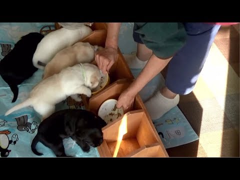 生後21日目~48日目。ラブラドールの仔犬が最も可愛くて愛らしい時期。いわゆる《天使の時代》です。そして、離乳食プログラムは、この時期の一大イベントです。いよいよ、繁殖ボランティアが本領を発揮する時期が来ました。一日24時間、仔犬の食事と下の世話に明け暮れる《魔の季節》の到来です。